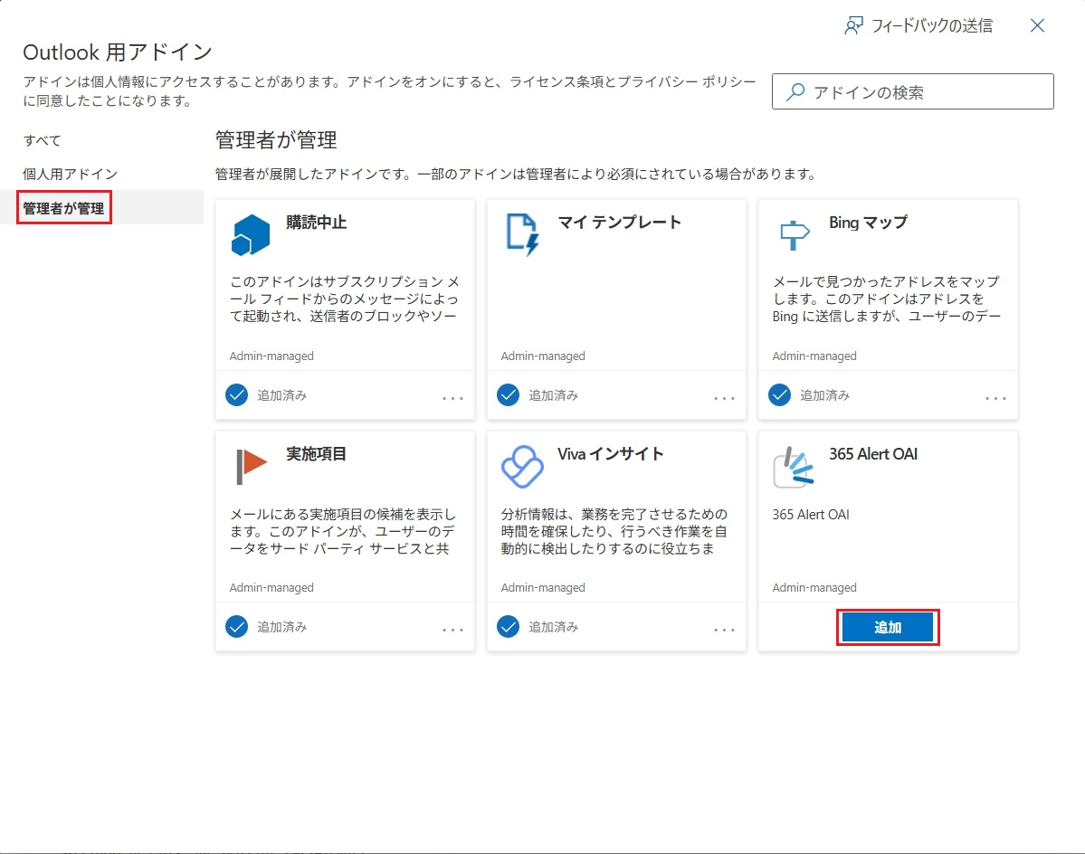 以下の画面で、[管理者が管理]をクリックし、365 Alert OAIの[追加]ボタンをクリックします。