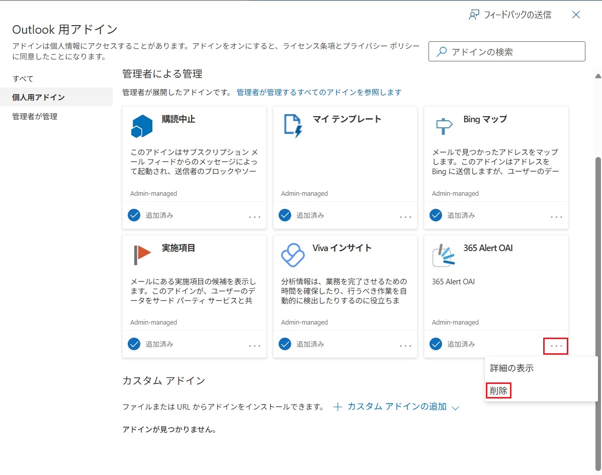ヒント各自でインストールした場合は、[カスタムアドイン]の項目に365 Alert OAIが表示されます。同様に[削除]とクリックしてください。