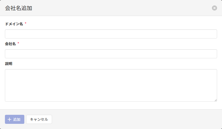 設定設定画面会社名会社名を追加するこのページの見出し会社名を追加する以下では、会社名画面からアクセス可能な会社名追加画面で可能な操作について記載します。 会社名追加画面 会社名の追加 会社名追加画面で以下の項目を入力し、[追加]をクリックして会社名を追加します。 項目名説明ドメイン名必須こちらを参照してドメイン名を指定します。会社名必須こちらを参照して会社名を指定します。説明こちらを参照して説明を指定します。