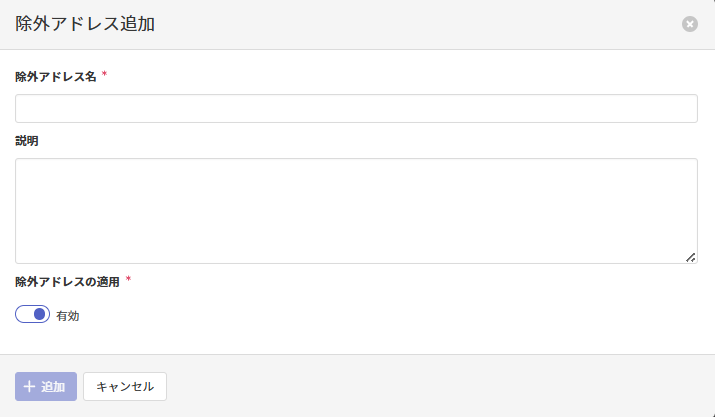 設定設定画面内部ドメイン除外アドレスを追加するこのページの見出し除外アドレスを追加する以下では、内部ドメイン画面からアクセス可能な除外アドレス追加画面で可能な操作について記載します。 除外アドレス追加画面 除外アドレスの追加 除外アドレス追加画面で以下の項目を入力し、[追加]をクリックして除外アドレスを追加します。 項目名説明除外アドレス必須こちらを参照して除外アドレスを指定します。説明こちらを参照して説明を指定します。除外アドレスの適用必須除外アドレス追加後に除外アドレスを有効化するか否かを指定します。