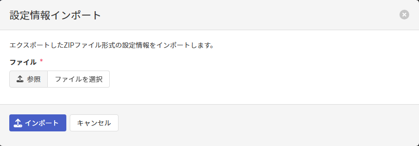 設定設定画面ファイルファイルをインポートするこのページの見出しファイルをインポートする以下では、ファイル画面からアクセス可能な設定情報インポート画面で可能な操作について記載します。 設定情報インポート画面 設定情報ファイルのインポート インポート対象のファイルを指定し、[インポート]をクリックします。