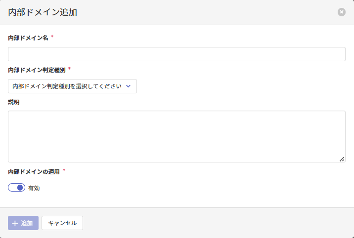内部ドメイン追加画面で以下の項目を入力し、[追加]をクリックして内部ドメインを追加します。