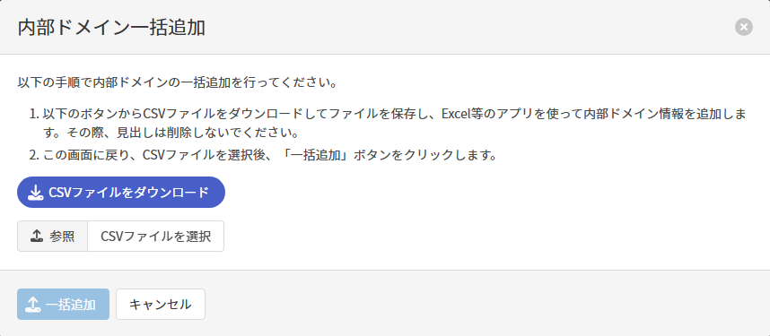 CSVファイルに以下の項目を入力し、ファイルを指定したうえで[一括追加]をクリックして内部ドメインを更新します。
