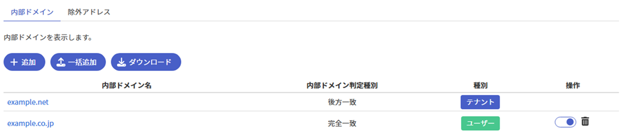 内部ドメイン画面では、内部ドメインと除外アドレスの確認・追加・更新・削除ができます。