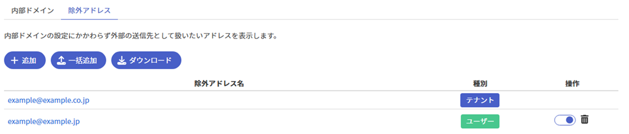 除外アドレス一覧の[操作]列のトグルボタンの意味は以下の通りです。