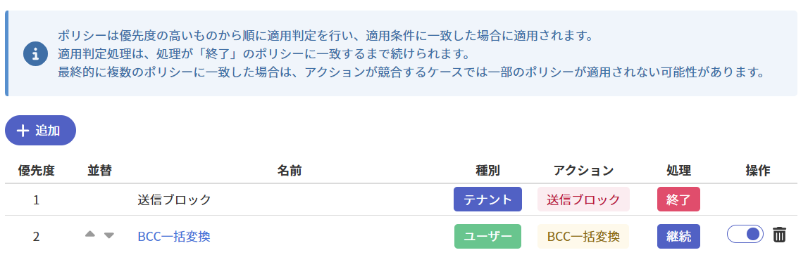 | 6 | 処理 | 該当ポリシーの後続処理停止が有効の場合は終了、無効の場合は継続と表示されます。 |