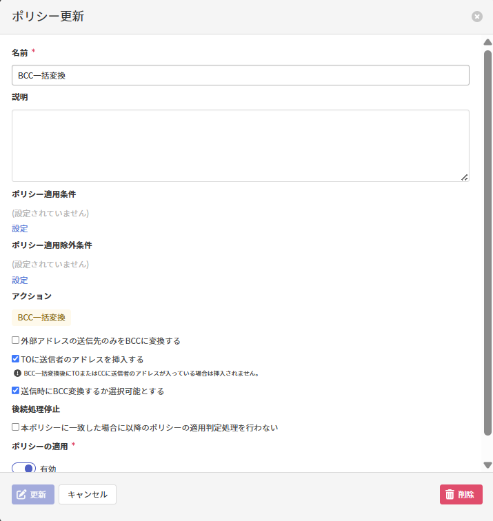 ポリシー更新画面で以下の項目を入力し、[更新]をクリックしてポリシーを更新します。